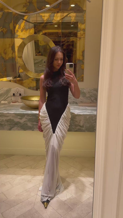 Halter Maxi Dress with Contrasting Ruched Paneling - Black/White