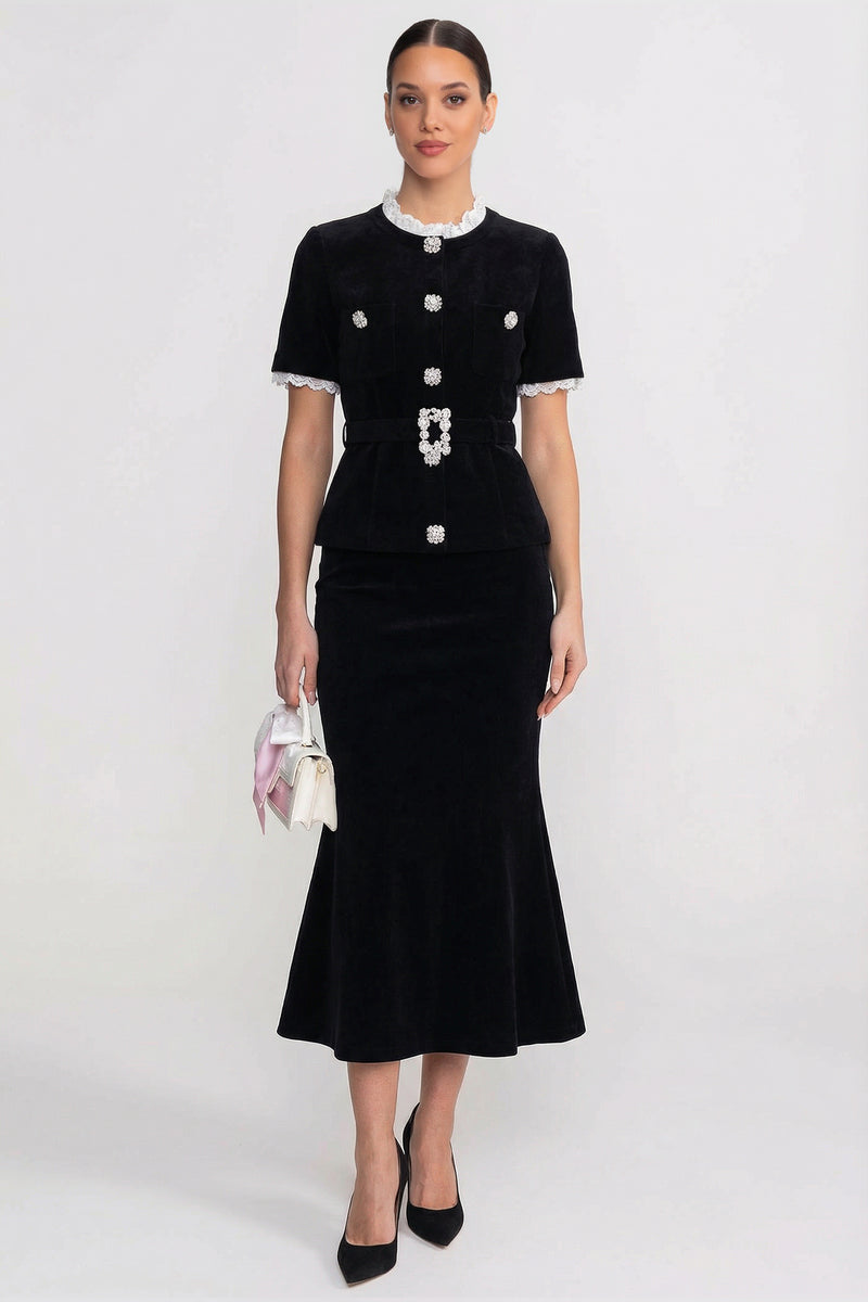 Coordinato a maniche corte con vita a peplo e cintura con bottoni di cristallo - Nero